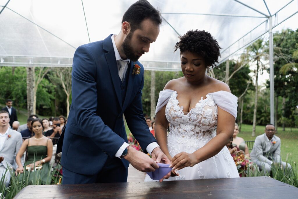 Ao planejar a cerimônia, o casal escolheu representar essa trajetória com um ritual simbólico que traduzia o desejo de seguirem viajando lado a lado. “A cada dobra, eles reafirmavam que não importa o tamanho das ondas; enquanto navegarem de mãos dadas, sempre chegarão ao melhor destino: o coração um do outro”, conta Elaine. O momento, além de visualmente poético, trouxe uma assinatura emocional para o casamento — e fez com que os convidados entendessem, sem explicações longas, o que unia os dois.