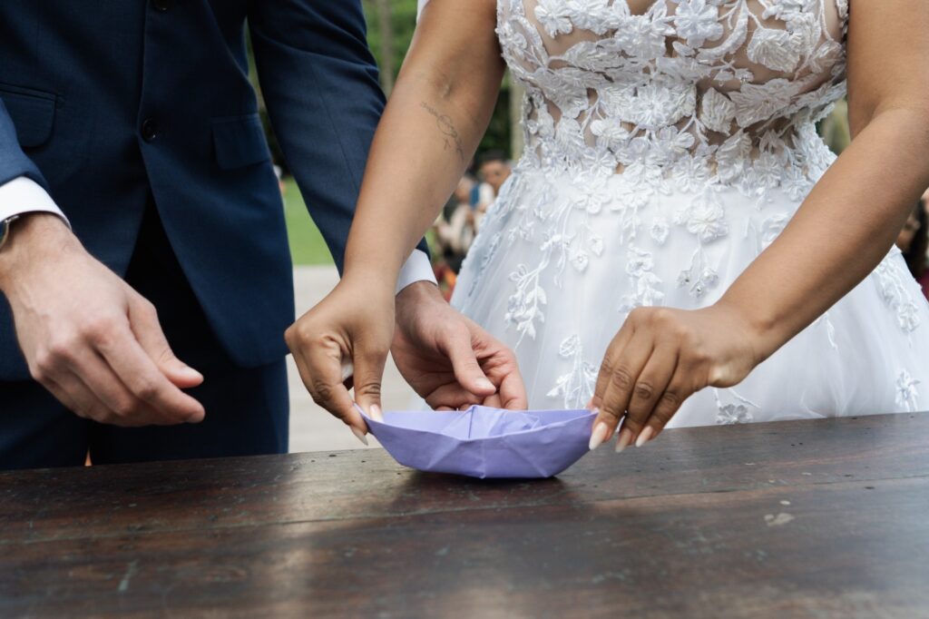 Entre os exemplos que mostram como um detalhe pode virar o coração da cerimônia, Elaine relembra a história de Priscila e Marcos. O pedido de namoro aconteceu em um barco e, desde então, em cada ocasião especial, um barquinho de papel surgia como lembrança desse amor — um símbolo delicado que acompanhava a relação como um bilhete silencioso: “estamos navegando juntos”.