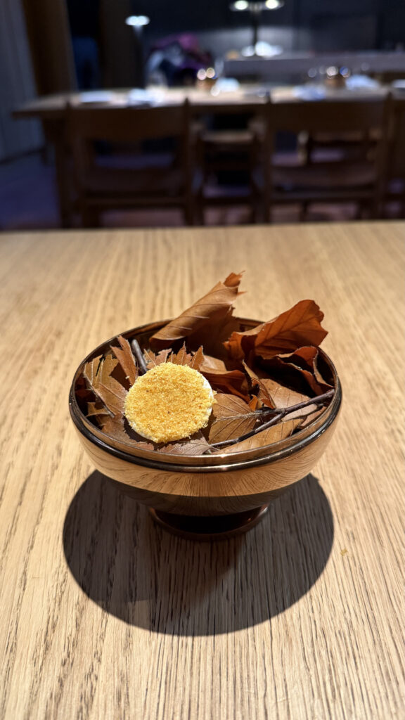 O primeiro destaque é o Restaurante Coro, localizado dentro do extraordinário Palazzo Petrvs (Via del Duomo, 23, Orvieto), onde me hospedei por seis dias. Foi ali que sozinha e, portanto, muito bem acompanhada, que rompi o Ano-Novo em um cenário absolutamente cinematográfico. A experiência começou de forma um pouco intrigante. Fui conduzida até minha mesa e o maître disse algo como: “Sua mesa fica ao lado da sacristia”. Confesso que fiquei um pouco perplexa. Sacristia? Em um restaurante? Só então percebi que o restaurante funciona dentro de uma antiga igreja magnificamente restaurada. Aquilo que antes era espaço litúrgico tornou-se um salão elegante, iluminado suavemente e com músicos tocando harpa ao fundo. O menu era fixo, cuidadosa e magnificamente elaborado. Logo na entrada chegou um prato que era literalmente, pelo menos em sua forma, uma hóstia. Cada etapa da orgia degustativa era delicada e simbólica, estrategicamente pensada para dialogar com o ambiente histórico. O resultado é um restaurante sofisticado, muito bem avaliado e, sem dúvida, uma das experiências gastronômicas mais marcantes da cidade.