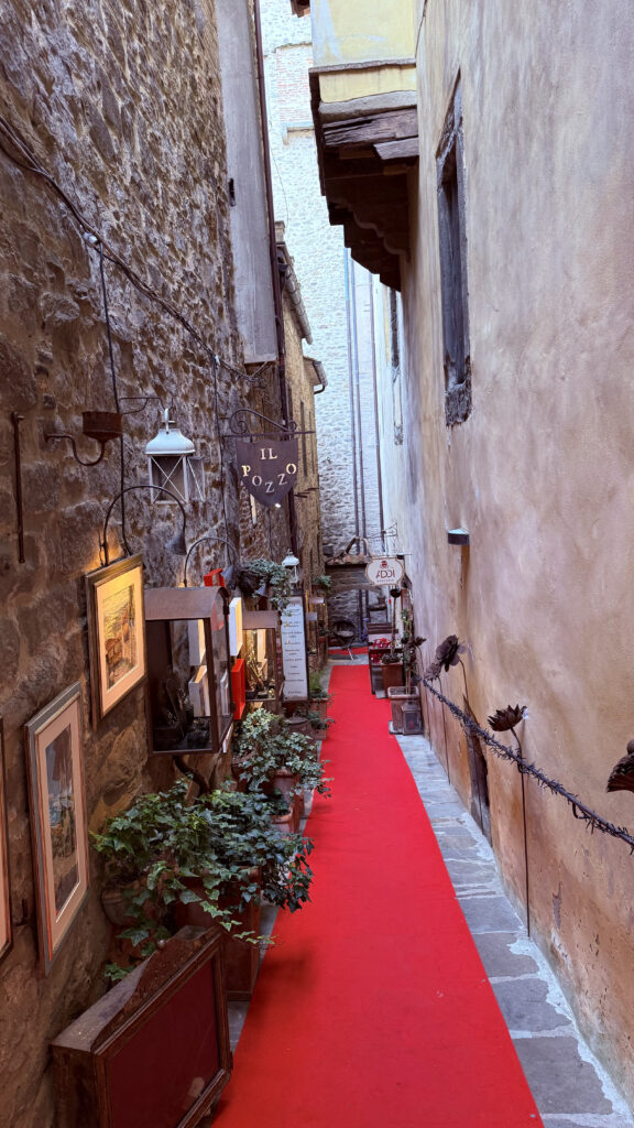 A chegada também não é simples. Como em muitos borgos italianos, não é possível entrar de carro no centro histórico. É preciso estacionar fora das muralhas e subir caminhando por ruas de pedra bastante inclinadas. A cidade fica bem no alto e tem aquela atmosfera de vila suspensa no tempo.