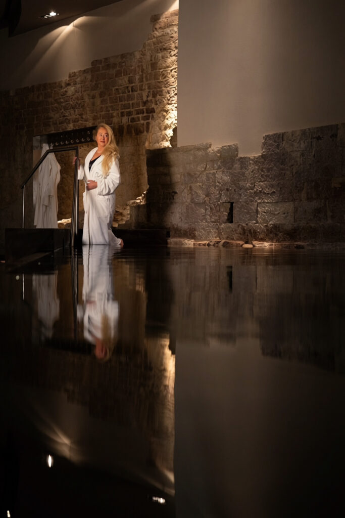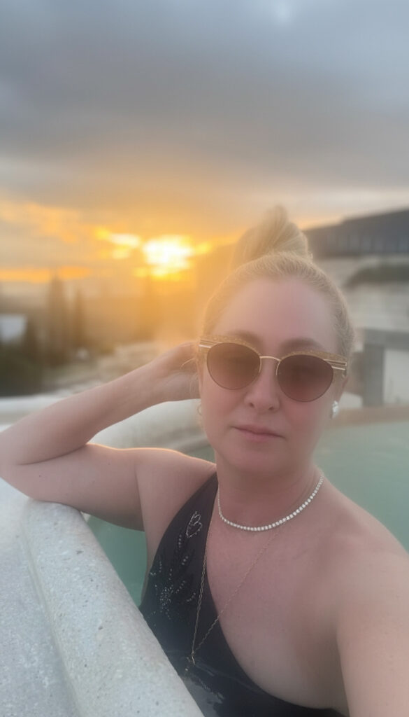 O resultado é uma experiência única: mergulhar em piscinas externas com água quente enquanto o ar ao redor está gelado. Na semana da minha estadia, inclusive, chegou a nevar intensamente. A cena parecia saída de um filme: vapor subindo das piscinas, colinas cobertas de branco e um silêncio absoluto ao redor.