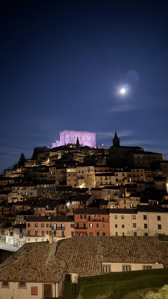 E a sensação de recolhimento era ainda mais intensa: pouquíssimo movimento nas ruas, muitas portas fechadas e aquela atmosfera de inverno em que as pessoas parecem desaparecer mais cedo para dentro de casa. Ainda assim, o borgo é muito bonito, com ruas estreitas, pedra antiga e uma vista impressionante das montanhas da região.