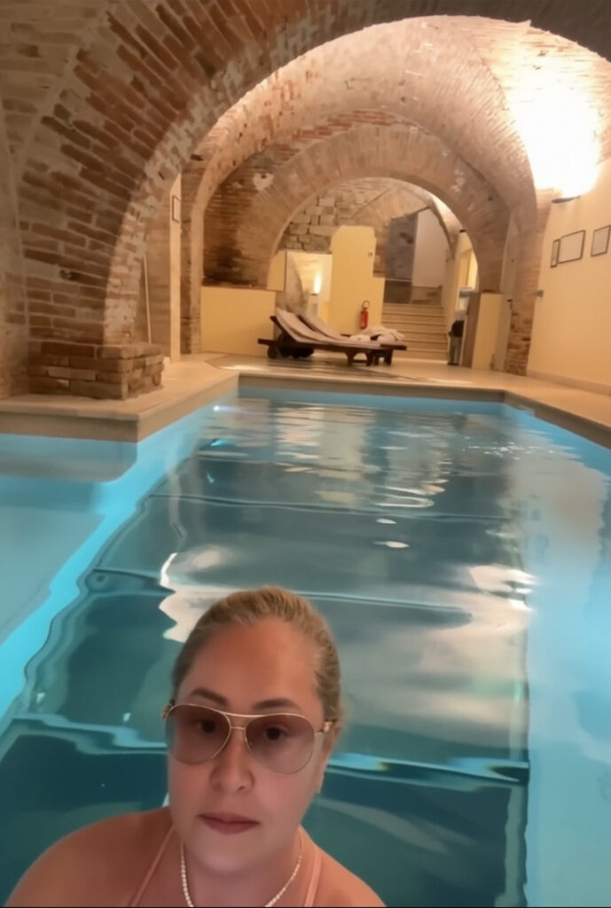 O hotel é espetacular, verdadeiro clássico italiano, muito elegante, com um spa maravilhoso e uma piscina impressionante, instalada sob abóbadas medievais e com piso de vidro revelando ruínas etruscas. Todavia, aonde eu chegava, os lugares estavam fechados ou prestes a fechar. No próprio hotel me avisaram que o spa poderia fechar porque havia pouquíssimos hóspedes. Acabei ficando apreensiva. No final, parece que chegaram mais pessoas e o spa permaneceu aberto, mas até isso virou uma pequena via-crúcis logística.